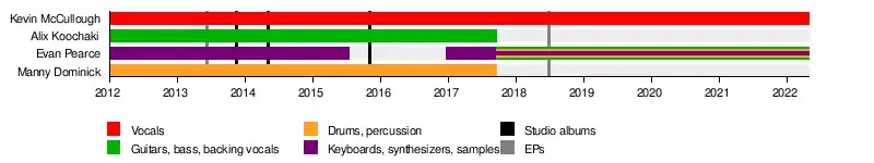 The band is made up of vocalist Kevin "Ghost" McCullough and keyboardist Evan Pearce, who left the band for a short period of time beginning in 2015, just a few weeks before the release of Evolution. He returned late 2016. From the group's foundation in 2012 until 2017 the band also included drummer MannYtheDrummer and guitarist/backing vocalist Alix Koochaki.