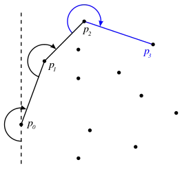 The gift wrapping algorithm begins with i=0 and a point p0 known to be on the convex hull, e.g., the leftmost point, and selects the point pi+1 such that all points are to the right of the line pi pi+1. This point may be found in O(n) time by comparing polar angles of all points with respect to point pi taken for the center of polar coordinates. Letting i=i+1, and repeating with until one reaches ph=p0 again yields the convex hull in h steps. In two dimensions, the gift wrapping algorithm is similar to the process of winding a string (or wrapping paper) around the set of points.