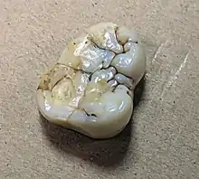 Gigantopithecus molars have a high cavity rate of 11%, which could mean fruit was commonly included in its diet.[2][23] The molars from Gigantopithecus Cave frequently exhibit pitting enamel hypoplasia, where the enamel improperly forms with pits and grooves. This can be caused by malnutrition during growth years, which could point to periodic food shortages, though it can also be induced by other factors.[23] Specimen PA1601-1 from Yanliang Cave shows evidence of tooth loss of the right second molar before the eruption of the neighboring third molar (which grew slantedly), which suggests this individual was able to survive for a long time despite impaired chewing abilities.[7]