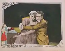 Gigolo is a 1926 American silent romance drama film produced by Cecil B. DeMille and released by Producers Distributing Corporation. William K. Howard directed and Rod La Rocque and Jobyna Ralston star. The film is based on a novel, Gigolo, by Edna Ferber.[1][2]