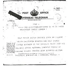 Near the end of Chesterton's life, Pope Pius XI invested him as Knight Commander with Star of the Papal Order of St. Gregory the Great (KC*SG).[29] The Chesterton Society has proposed that he be beatified.[33] He is remembered liturgically on 13 June by the Episcopal Church, with a provisional feast day as adopted at the 2009 General Convention.[34]