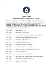 - Gazis, Olivia (May 1, 2018). "CIA Director nominee Gina Haspel: CIA releases timeline of her clandestine career". CBS News. Retrieved May 1, 2018.