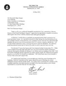 On May 14, Haspel sent a letter to Senator Mark Warner of Virginia stating that, in hindsight, the CIA should not have operated its interrogation and detention program.[76] Shortly thereafter, Warner announced he would back Haspel when the Senate Intelligence Committee voted on whether to refer her nomination to the full Senate.[76]