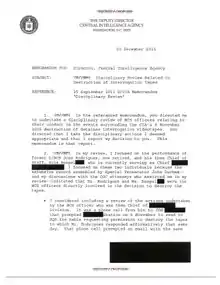 Haspel played a role in the destruction of 92 interrogation videotapes that showed the torture of detainees both at the black site she ran and at other secret agency locations.[31][36][37] A partially-declassified CIA document shows that the instruction for a new method of record keeping at the black site in Thailand, re-recording over the videos, took place in late October 2002, soon after Haspel's arrival.[38][39]