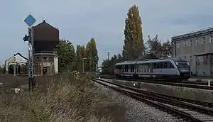 The Giurgiu railway station is a train station in the town of Giurgiu, Romania. The station was opened in 1869 as part of the Bucharest-Giurgiu railway.[1] Today, the station is only served by commuter (personal) trains to Bucharest, Grădiștea and Videle. The Giurgiu North railway station is located about one kilometer north of the station and is serviced by the Bosphorus Express operating between Bucharest and Istanbul.