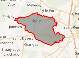 Located 10 km (6.2 mi) from Chalon-sur-Saône, Givry is a small town, famous for its listed monuments and its wines. It is surrounded on the southeast by the commune's forest, and on the east by vineyards; the commune of Givry also includes three hamlets: Cortiambles, Poncey and Russilly.