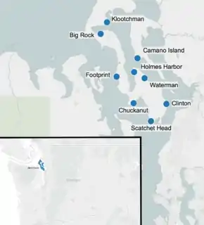 | Scatchet Head erratics are on the beach below bluffs at the southwest point of Whidbey Island.[18] | |