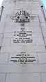 Stone arms rise on three steps to the north and south sides of the obelisk, turning to the west to form three sides of an enclosure open to the west, with a sculpture of a guardant couchant lion at the west end of each arm. A large stone slab is set into the ground within the enclosure, as if covering a tomb, bearing stone carvings of a wreath and a palm leaf.