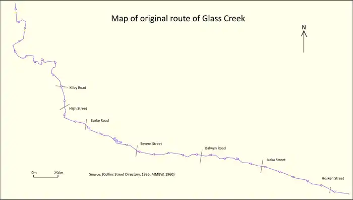 The original route of the creek originated near Loma Linda Grove in Greythorn, the eastern part of Balwyn North. It flowed through present-day Jacka Street and Gordon Barnard Reserves, crossed Balwyn Road, through Hislop and Macleay/Myrtle Park, through the residential areas roughly following Maylands Avenue, through Stradbroke Park near present-day Kew High School, under High Street and along the present-day Glass Creek Trail before joining up to the current course near the southern entrance to Hays Paddock. Thence it flowed north-west into the Yarra River.[4]