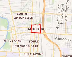 Glen Echo is a neighborhood located in the far northern part of the University District in Columbus, Ohio. The area was listed on the National Register of Historic Places in 1997. The name Glen Echo refers to Glen Echo Ravine, which runs along the northern edge of the neighborhood. Principal streets in the area are Glen Echo Drive, Summit Street, Glenmawr Avenue, North Fourth Street, Arcadia, Cliffside Drive, and more. One street, Parkview Drive, was platted in the ravine basin, but was later abandoned.