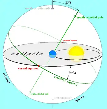 - The imaginary great circle of a body's celestial sphere that is coplanar with the body's terrestrial equator. On Earth, the plane of the celestial equator is the basis of the equatorial coordinate system. Due to Earth's axial tilt, this plane is currently inclined at an angle of 23.44 degrees with respect to the ecliptic.