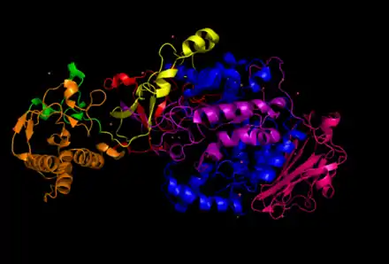 Glucansucrase has 5 major domains: A, B, C, IV, and V. The domains in glucansucrase, however, have a different arrangement than those in α-amylase. The folding characteristics of α-amylase and glucansucrase are still very similar, but their domains are permuted.[5][6][3] Domains A, B, IV, and V are built from two discontiguous parts of the polypeptide chain, causing the chain to follow a U-shape.[1] From the N- to C-terminus, the polypeptide chain goes in the following order: V, IV, B, A, C, A, B, IV, V (see figure at top right).[4] The C domain is the only one made up of a continuous polypeptide sequence.