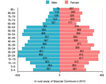 According to the 2011 Poland census, there were 26,077 people residing in Staszów Commune, of whom 48.8% were male and 51.2% were female (out of which the population in rural areas amounts to 10,969, of whom 49.6% were male and 50.4% were female). In the commune, the population was spread out, with 19.4% under the age of 18, 38.3% from 18 to 44, 25.1% from 45 to 64, and 17.1% who were 65 years of age or older (out of which the population in rural areas amounts to 20% under the age of 18, 38.5% from 18 to 44, 22.8% from 45 to 64, and 18.6% who were 65 years of age or older).[1]