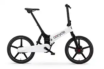 Gocycle is an electric bicycle manufactured by Karbon Kinetics Limited, a company founded in 2002 by Richard Thorpe, who set out to create the world's best urban electric bike. Thorpe is an industrial designer who once worked at the racing car company McLaren.[1] The Gocycle has interchangeable quick release wheels,[2] a fully enclosed chain, gearing and cabling, a moulded magnesium frame and wheels and a flat pack storage and transport system, in which the bicycle folds up and can be carried in a case.[3] The electric motor is powered by a rechargeable lithium ion battery.