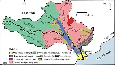 The primary/initial catchment of the Godavari drainage basin is largely represented by the basalt of the Deccan Volcanic Province (~50% of the total basin area). This is followed by the Precambrian granites and gneisses of the eastern Dharwar Craton, sandstones, shales and limestones of the Gondwana Supergroup, various sedimentary units of Cuddapah and Vindhyan basins, charnockites and khondalites of the Proterozoic Eastern Ghats Mobile Belt and the sandstones of the Rajahmundry Formation.[34] The Godavari River carries the largest sediment load among the peninsular rivers and the majority of the mass transfer in Godavari occurs during the monsoon.[35] Mineral magnetic studies of the Godavari River sediments suggest that the floodplains in the entire stretch of the river are characterized by a Deccan basalt source. The bed loads on the other hand are of sourced from local bedrock. Influx of Deccan source in the Godavari River up to the delta regions and possibly in the Bay of Bengal off the Godavari, therefore, can be related to the intensive chemical weathering in the Deccan basalts.[34] Abrupt increase in δ13C values and decrease in TOC content accompanied with a significant increase in ferrimagnetic mineral concentration in Bay of Bengal sediments from ~3.2 to 3.1 cal. ka BP reflected a shift of organic carbon and sediment source and a severe decline in vegetation coverage. Such phenomena indicate intensified deforestation and soil/rock erosion in the Deccan Plateau producing higher ferrimagnetic mineral inputs, which is in agreement with significant expansion of agricultural activities in the Deccan Chalcolithic cultural period.[36]