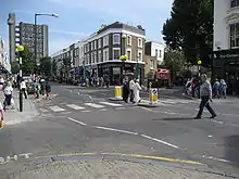 The Golborne Road area is sometimes known as "Little Morocco" due to the number of Moroccan restaurants and shops selling Maghrebian products located along the road.[2] The road also has renown in the Portuguese community for the two Portuguese pâtisseries at one end, Cafe d'Oporto and Lisboa Patisserie. The junction of Golborne Road and Southam Street was the site of the murder of Antiguan immigrant Kelso Cochrane in 1959, an attack widely viewed as racially motivated. His killers were never caught. In 2009, a blue plaque was erected at the site of the murder.[3]