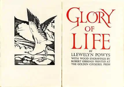 The first book published under the new regime was The House with the Apricot (1933) by H. E. Bates. It featured wood engravings by Agnes Miller Parker and had been planned by Gibbings. The first major book of the new regime was The Glory of Life (1934) by Llewelyn Powys, a large quarto with wood engravings by Gibbings.