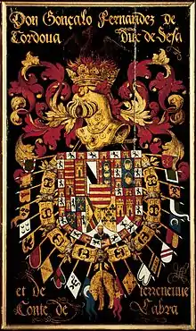 Gonzalo II Fernández de Córdoba (Cartagena, 27 July 1520 – 3 December 1578 in Odón), third Duke of Sessa, was the grandson of a Viceroy of Naples, Gonzalo Fernández de Córdoba, first duke of Sessa, the son of the first duke's daughter, Elvira Fernández de Córdoba y Manrique, and of her husband, Luis Fernández de Córdoba. Gonzalo II, holder of several dukedoms and many other lesser titles, Spanish and Italian, was Captain General of the Spanish Troops in Italy, Great Admiral of the Kingdom of Naples, and a member of the Spanish king Royal Council for Italy and the Royal War Council.