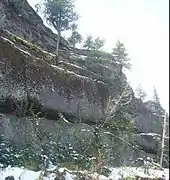 Russian popular articles have reported that scientists have proposed the rock formation to be the result of geological processes associated with the intense weathering of the rock composing Mount Shoriya.[2][3] Both tectonic forces acting on deeply buried bedrock and pressure release that occurs within nearsurface bedrock as it is uplifted and eroded commonly form rectangular, block-like, rock formations that consist of jointed rock.[4] Tectonic forces acting on deeply buried massive bedrock, such as granite, and pressure release as this bedrock is uncovered by erosion, can create sets of joints which are known as orthogonal joint sets, that intersect at nearly 90 degrees. Orthogonal joint sets quite often result in the formation of rock formations that are comparable in size and shape to the blocks shown in pictures of the alleged megaliths.[5][6]