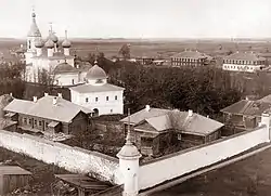 The Church of the Assumption which gave its name to the convent was constructed and consecrated significantly earlier than the convent. The first church was wooden, one of the oldest buildings in Vologda. In 1303, during the feast of the Assumption, Theoctist, bishop of Novgorod, consecrated a Church of Our Lady in Vologda.[14] Evidently, in 1499, this ancient church burned to the ground, with its icons and manufactures, its books and indeed the entire monastery.[15] The reference to monastery here likely means some chambers that existed at the church - although, these were not officially monastic. In the place of the burned building, another wooden church was constructed. This, in turn, was replaced by a stone edifice, which then became the monastery's church.