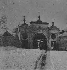 To the end of the 1790s, the convent was surrounded by a wooden wall. In the 1890s, a new stone wall was built, complete with turrets at its four corners, and in circumference, considerably larger than the old wooden walls. It was about 3 metres tall, 780 metres long. There were two gates in the walls. The eastern, Sacred gates comprised two wings, decorated with round windows. The southern gate was a more modest affair for pedestrians.[2][23][27][32]
