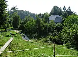 Gorski Vrh is a scattered village on the slope south of the highest point on the Šentviška Gora Plateau, Črv Peak (Slovene: Črvov vrh, 974 meters or 3,196 feet), also known as Črv Hill (Slovene: Črvov grič).[4] Košarica Hill (961 meters or 3,153 feet) rises in the eastern part of the village. Gorski Vrh includes the hamlets and isolated farms of Jerovica, Podkremenk, Štrin, Travnikar, and V Griču (Slovene: V griču). The land has a karst character and generally lacks running surface water. There are karst caves in the vicinity, including Skrinjce Cave, where a short intermittent stream runs into the ground. The few springs in the area (at Travnikar, Oplence, Poloji, Skrinje, and Podkorito) produce water only after heavy rainfall. The hill slopes in the village are mostly covered in mixed woods. There are very few pastures in the village, but low-quality hay fields are also used for pasturing.[2]