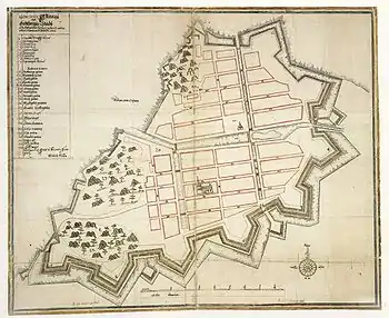 Early plan of the settlement of Gothenburg (1644). By the time of this map, the former stave church had already been replaced with the first cathedral, depicted near the middle.