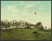 Built on a hill known as Mount Fitzwilliam and completed in 1806, this imposing stuccoed-coral-rock building on Duke Street is the Bahamian archipelago's foremost example of Georgian Colonial architecture.[1] In 1814, Colonel Don Antonio de Alcedo, a Spanish scholar and soldier, wrote admiringly of its effect.[2] The Oriental Herald, in 1825, stated: "The new Government-House, standing on the centre of the ridge that overlooks the town, was built by a sum voted by the House of Assembly from the funds of the Treasury and cost upwards of 20,000l. It is built in the European style of architecture, and is universally considered the best building of the kind throughout the West Indies".[3]