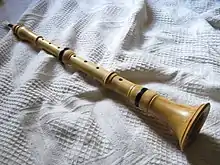 The instrument consists of three turned wooden parts reinforced at the joints with horn.