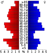 In the county, the population was spread out, with 22.50% under the age of 18, 5.30% from 18 to 24, 23.10% from 25 to 44, 25.40% from 45 to 64, and 23.70% who were 65 years of age or older. The median age was 44 years. For every 100 females there were 95.10 males. For every 100 females age 18 and over, there were 92.20 males.