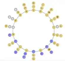 The mature protein contains two nuclear localization signals, pat4 and pat7.[16] There are four dileucine motifs, three located within or close to the GRAM domain.[16] A leucine zipper pattern extends through a majority the transmembrane region.[16] A SUMOylation site is located directly after the VASt domain.[17] The proteins secondary structure consists of alpha-helices, beta-strands and coils.[18] Beta-strands are mainly located within the two domains, while the alpha-helixes are concentrated near the transmembrane region. Three disulfide bonds are predicted throughout the protein.[19]