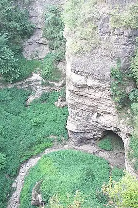 Grand Gulf State Park is a state-operated, privately owned and publicly accessible, geologic preserve near Thayer, Missouri, United States, encompassing a forked canyon that is the remnant of an ancient collapsed dolomite cave system.[4] The land that is now the park was acquired by conservationist Leo Drey (1917–2015) before becoming part of the Missouri state parks system. The 322-acre (130 ha) state park has been operated by the Missouri Department of Natural Resources under a lease agreement with the L-A-D Foundation since 1984.[5] Grand Gulf was declared a National Natural Landmark in 1971 as an excellent example of karst topography and underground stream piracy.[6] A 60-acre (24 ha) portion of the park was designated by the state as the Grand Gulf Natural Area in 1986.[7]