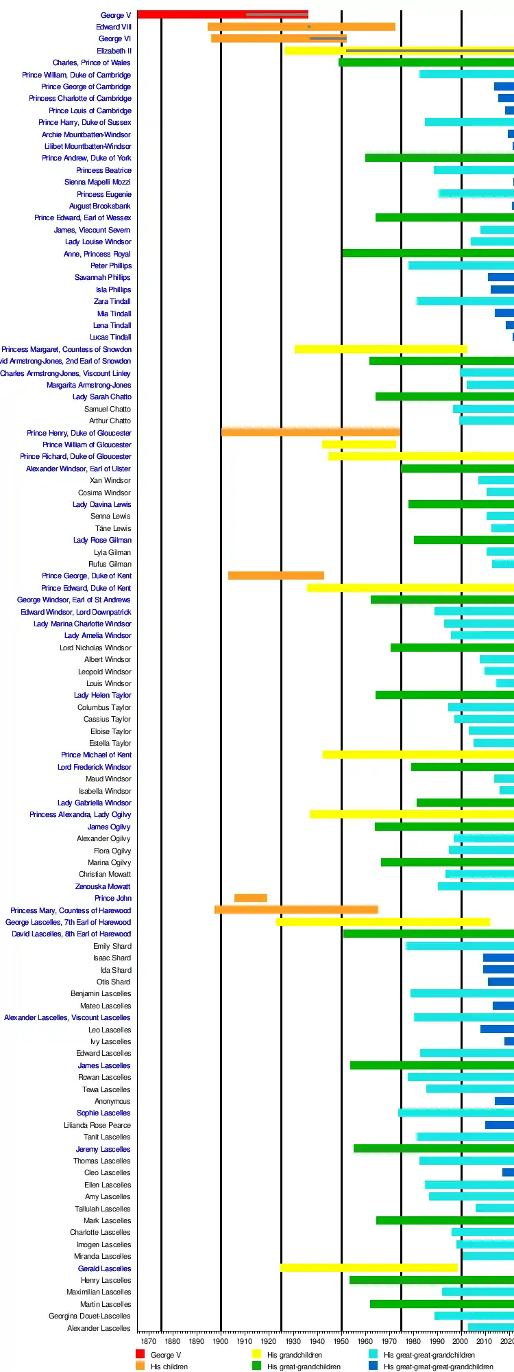 A list of living non-Catholic descendants of George V's sons is shown at line of succession to the British throne. A list of all members of the house of Windsor is at List of members of the House of Windsor.