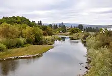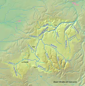 The Grande Ronde River (/ɡrænd rɑːnd/ or, less commonly, /ɡrænd raʊnd/) is a tributary of the Snake River, 182 miles (293 km) long,[6] in northeastern Oregon and southeastern Washington in the United States. It drains an area southeast of the Blue Mountains and northwest of the Wallowa Mountains, on the Columbia Plateau. It flows through the agricultural Grande Ronde Valley in its middle course and through a series of scenic canyons in its lower course.