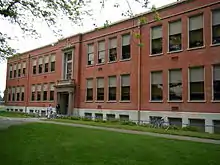 Ulysses S. Grant High School opened in September 1924, with 1,191 students.[4] Many of the schools in the Portland Public School district that were built between 1908 and 1932 were designed by architects Floyd Naramore and George Jones. During the early 1920s, so many schools were being built simultaneously in Portland, the district had to hire another architectural firm to design Grant High School, which is in the Classical Revival style by architects Knighton and Howell. In November 1923, the bricklayers working on Grant went on strike after the district tried to cut costs by using a maintenance worker to lay bricks.[5][6]