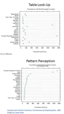 Graphical perception is the human capacity for visually interpreting information on graphs and charts. Both quantitative and qualitative information can be said to be encoded into the image, and the human capacity to interpret it is sometimes called decoding.[1] The importance of human graphical perception, what we discern easily versus what our brains have more difficulty decoding, is fundamental to good statistical graphics design, where clarity, transparency, accuracy and precision in data display and interpretation are essential for understanding the translation of data in a graph to clarify and interpret the science.[2][3][4][5][6][7]