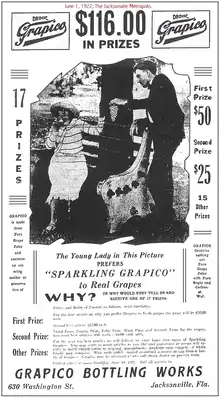 In June 1922, Grapico Bottling Works furthered the connection between the artificially flavored beverage and real grape juice through an advertisement campaign.[21] On June 1, 1922, The Jacksonville Metropolis published a Grapico Bottling Works advertisement announcing a ten-day writing contest that offered US$116 in prize money for essays on why a consumer would prefer "Sparkling Grapico" over real, fresh grapes.[21] The advertisement indicated that Grapico was made from Pure Grape Juice with pure sugar and carbonated water and had no coloring or preservatives.[21] Although not true, this information was consistent with the Grapico product labels used by J. Grossman's Sons on the barrels that were shipped to and received by R. R. Rochell.[22]