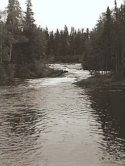 The remote river flows through the Churchill River Upland portion of the Midwestern Canadian Shield forests and is surrounded by mixed forest with stands of black spruce, white spruce, jack pine, and trembling aspen. The shoreline is characterized by steeply sloping irregular rock ridges and poorly drained areas of muskeg.[6] Typical of the Canadian Shield, the river runs through rolling hilly terrain with abundant glacially scoured rock outcrops.[7]