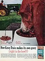Originally developed by General Foods, the Gravy Train brand was introduced in 1959 and trademarked in 1960.[2] It was the first brand of dog food to have a brown gravy form when warm water is added to the dry kibble, mixing with the kibble's powder coating. The gravy is intended to make the food more palatable. The advertising catchphrase was "the gravy taste dogs can't wait to finish".