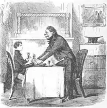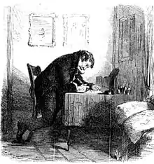 Dickens, whose health was not the best, felt "The planning from week to week was unimaginably difficult" but persevered.[39] He thought he had found "a good name", decided to use the first person "throughout", and thought the beginning was "excessively droll": "I have put a child and a good-natured foolish man, in relations that seem to me very funny."[41] Four weekly episodes were "ground off the wheel" in October 1860,[42] and apart from one reference to the "bondage" of his heavy task,[43] the months passed without the anguished cries that usually accompanied the writing of his novels.[39] He did not even use the Number Plans or Mems;[N 2] he had only a few notes on the characters' ages, the tide ranges for chapter 54, and the draft of an ending. In late December, Dickens wrote to Mary Boyle that "Great Expectations [is] a very great success and universally liked."[10]