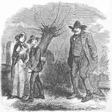 In his Book of Memoranda, begun in 1855, Dickens wrote names for possible characters: Magwitch, Provis, Clarriker, Compey, Pumblechook, Orlick, Gargery, Wopsle, Skiffins, some of which became familiar in Great Expectations. There is also a reference to a "knowing man", a possible sketch of Bentley Drummle.[32] Another evokes a house full of "Toadies and Humbugs", foreshadowing the visitors to Satis House in chapter 11.[32][33] Margaret Cardwell discovered the "premonition" of Great Expectations from a 25 September 1855 letter from Dickens to W. H. Wills, in which Dickens speaks of recycling an "odd idea" from the Christmas special "A House to Let" and "the pivot round which my next book shall revolve."[34][35] The "odd idea" concerns an individual who "retires to an old lonely house…resolved to shut out the world and hold no communion with it."[34]