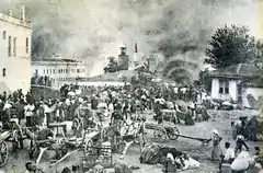 Thessaloniki soon became a transit center for Allied troops and supplies, and the city filled with thousands of French and British soldiers, numbering up to 100,000.[1] The population of the city at the time is dubious, with some sources claiming around 150,000 and others 278,000.[1] French navy official Dufour de la Thuillerie writes in his report that "I saw Thessaloniki, a city of more than 150,000 people, burn".[1]