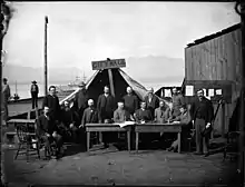 The day after the fire, the manager of the Hastings Mill, Richard Alexander, announced free lumber for anyone rebuilding their homes and businesses after the fire.[1] Impromptu emergency shelters were set up in the few surviving structures.[1] Several blocks of ice found beneath the wreckage of the Deighton House ice shed provided drinking water to residents.[1] The city council set up a temporary tent city hall.[1] A few months later, one of the first brick buildings in Vancouver became the city hall building.[1] The day after the fire, to address looting, Mayor MacLean appointed three special constables, Jackson Abray, V.W. Haywood, and John McLaren, to join constable John Stewart as the first Vancouver police force.[1][3] The police force operated out of the city hall tent whilst Vancouver was rebuilt.[1]