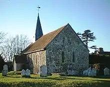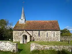 Minimal restoration was performed in the 19th century, in contrast to many other Sussex churches, although the original bell-turret was replaced by one topped with a spire.[6][10] A new entrance, set in a porch, was added on the south side, and a vestry was built onto the north wall—although this was removed in the mid-20th century.[6] Most of the internal fittings are early 19th-century.[3] When the vestry was being built, five soldiers were found buried next to the church wall: they had been killed at the Battle of Greatham Bridge during the English Civil War.[6][11]