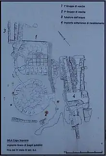 The Greek Baths of Gela are ancient baths which were discovered in 1957, near the Ospizio di Mendicità on via Europa, Capo Soprano, which date to the Hellenistic period.[1] Like the rest of the city, the baths were demolished in 282 BC after the conquest of the city by the Akragantine tyrant Phintias.