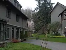 Green College consists of two heritage buildings: the Coach House and Graham House, the latter designed by Maclure and Fox in 1915,[16] a series of residential blocks, guest house accommodations, Green Commons, a shared kitchen complex, gardens and a patio. The original garden design was by Thomas h. Mawson. The architectural style reflects the college's west coast location and is integrated with the forested oceanside landscape.