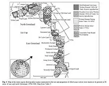 Wolves could not recover during the years between 1939 and 1978 in east Greenland due to factors such as geography and limited resources. Prey was insufficient and a dispersal corridor was hidden at 79 degrees north, thus restricting access to east Greenland.[12] In 1979, a wolf pair had arrived into the historical wolf range and during 1980 several wolf pairs were reported throughout eastern Greenland by military patrols.[12][15] The migrating wolves began to repopulate the area and have established a new population of wolves.[18] By 2011, they had re-established a population of 23 wolves through single and pairs of wolves following military dog-sled patrols from the northeast over distances of up to 560 km (350 mi) to eastern Greenland.[12]