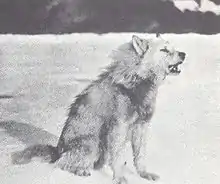 The oldest wolf remains in Greenland date to 7,600 years ago, however they may have been there earlier because their main prey, the caribou, date to 8,900 years ago.[3] Nowak proposed that during the Late Pleistocene two types of wolf evolved in the ice-free north of the Wisconsin glaciation, one in the Peary Land refugium in the far north of Greenland, the other in Alaska. Once the ice receded, the Peary Land wolves spread across Greenland and the Queen Elizabeth Islands. The Alaskan wolves spread to become the northern wolves referred to as Canis lupus arctos. Other wolves from south of the ice sheet would move north to interact with the northern wolves.[4][5] Other authors have disagreed that the Greenland wolf is a separate subspecies of Canis lupus because its close proximity to the range of the Arctic wolf. One author proposed that the Greenland wolf migrated from Canada by crossing the frozen sea ice between the two regions, and another has documented wolves on the ice when the Nares Strait froze.[5]