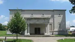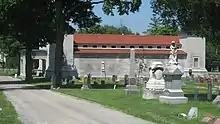 The Greenville Mausoleum is an Egyptian Revival structure in Greenville, Ohio, United States. Built in 1913,[1] this historic mausoleum is built of concrete covered with courses of limestone,[2] resting on a foundation of granite and covered with a roof of ceramic tiles.[3] Among its most distinctive elements are the marble pillars, topped with capitals of the Doric order, that line the main entrance. The main portion of the interior, built in a basilican style with multiple aisles, contains approximately four hundred concrete and marble crypts, and the building's wings house individual family crypts. It is lit by twelve clerestory windows under the roofline.[2]