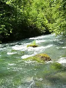 The spring emerges at the bottom of a narrow chasm. An upper outlet flowing from a cavern is only a fraction of Greer Spring's large flow. About 100 feet (30 m) downstream (north) the main outlet boils to the surface in a mixture of deep, aqua-blue water, moss covered rocks, and frothy whitewater. The newly formed surface stream then races down a small, steep, hardwood blanketed gorge dropping 65 feet (20 m) in elevation for 1.2 miles (1.9 km) to its confluence with the Eleven Point River. Greer Spring greatly increases the flow of the river, ensuring ample water for recreational activities, such as boating, even in the dry months. The vast amount of spring water changes the Eleven Point River into a coldwater stream for several miles downstream. The spring's cold water also creates ideal conditions for trout. The mouth of the spring branch is roughly 0.5 miles upstream (west) of the Missouri Route 19 bridge over the Eleven Point River. Greer Spring may be the most secluded and undisturbed big spring in the Ozarks. The spring has been owned by the U.S. National Forest Service since 1993.[3] Before 1993 the spring was in the caring hands of private ownership. The area surrounding the spring has been retaken by nature, but had a small fish hatchery and roads many years ago, the site has remained very scenic and unspoiled.